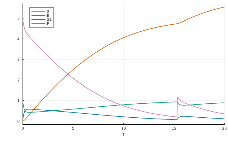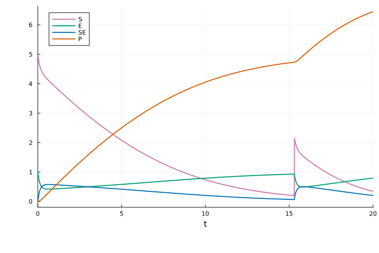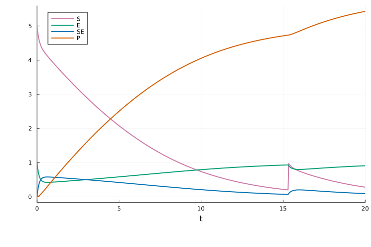 event = PEtabEvent(S == 0.2, :S => 1.0)PEtabEvent when S(t) == 0.2: S => 1.0Plotting the solution, we see the jump when S = 0.2: