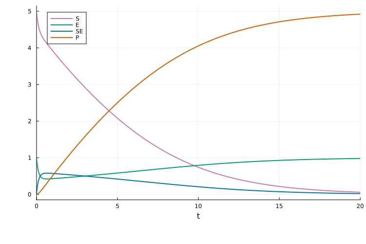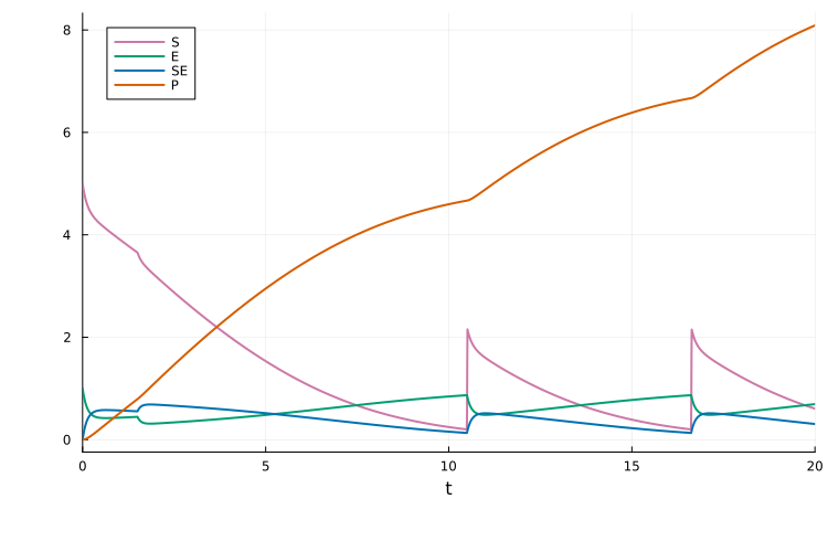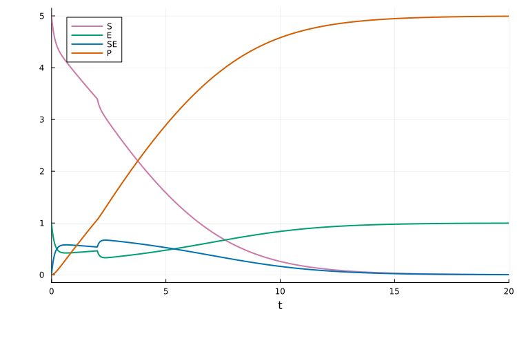 condition: Boolean expression that triggers the event on afalse→truetransition. For example,t == 3.0triggers att = 3.0;S > 2.0triggers when speciesScrosses2.0from below.assignments: One or more updates of the formtarget_id => target_value.target_id: Entity to update (Symbol,String, or SymbolicsNum). May be a model state id or model parameter id.target_value: Value/expression assigned totarget_id(Real,String, or SymbolicsNum). May use standard Julia functions (e.g. exp, log, sin, cos) and reference model states/parameters.