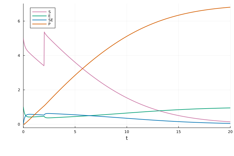 petab_prob = PEtabODEProblem(model)From simulating the model, we see the jump in S at t = 2.0: