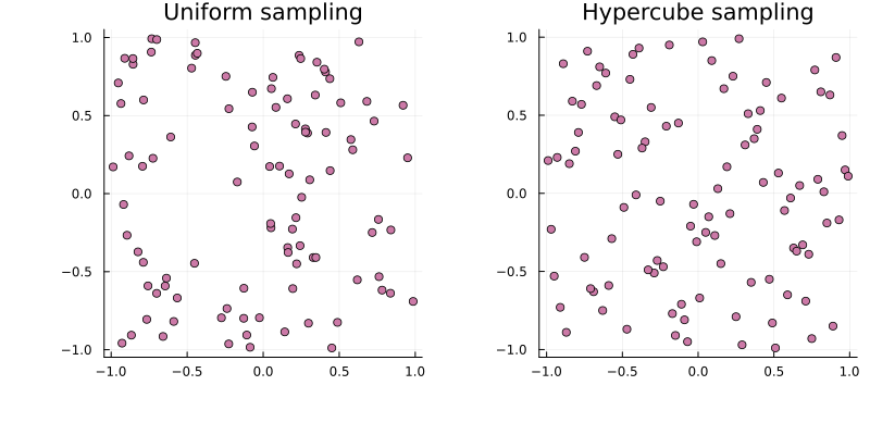 s_lhs[1, :], s_lhs[2, :]; title = "Hypercube sampling",