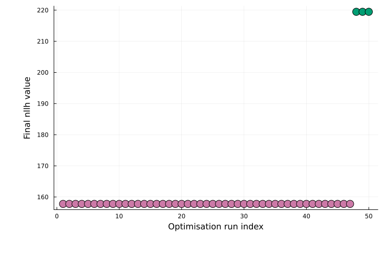 x0s = get_startguesses(rng, petab_prob, 50)Given x0s, multi-start estimation can be performed by calling calibrate repeatedly. For convenience, calibrate_multistart combines start-guess generation and estimation: