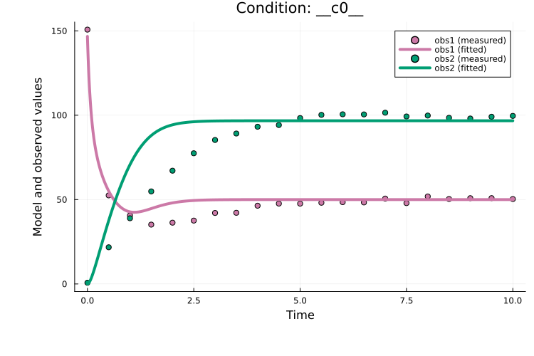 Optimiser algorithm = Optim_IPNewtoncalibrate returns a PEtabOptimisationResult containing the optimized parameters and common diagnostics. To visualize the fit and other diagnostics, see Plotting optimization results. For example, the model fit can be plotted with: