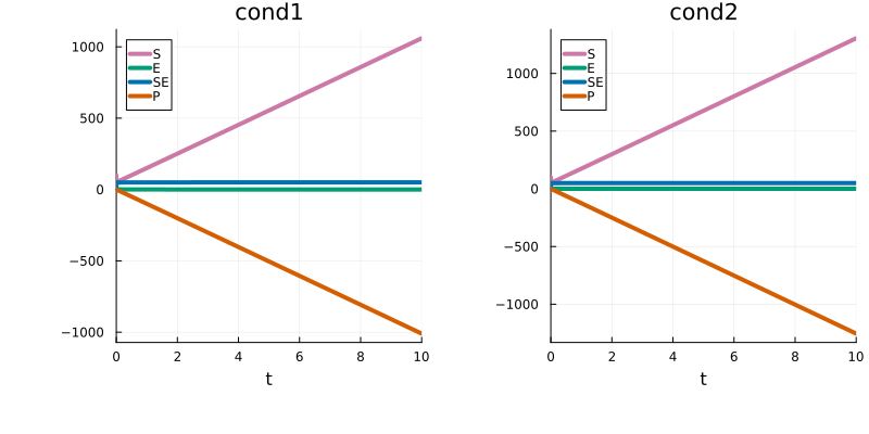 )The values of input1 and input2 are then provided via PEtabCondition. For instance, assign values for two simulation conditions cond1 and cond2: