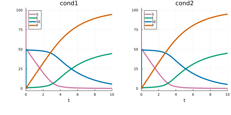 PEtabCondition cond2: input1 => 10×10×3×1 Array{Float64, 4}The input shape must match what lux_model expects. Given this, the PEtabODEProblem is created as usual, and as seen simulated model trajectories differ between conditions: