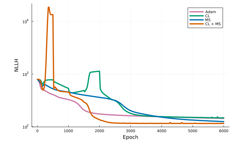 xlabel!("Epoch"); ylabel!("NLLH")