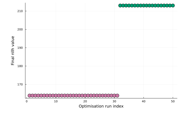 ms_res = calibrate_multistart(rng, petab_prob, Fides.BFGS(), 50)PEtabMultistartResult
