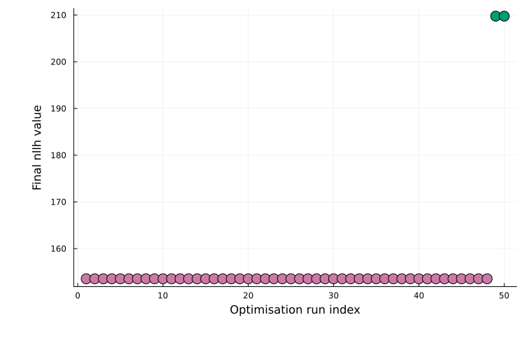 x0s = get_startguesses(rng, petab_prob, 50)Given x0s, multi-start estimation can be performed by calling calibrate repeatedly. For convenience, calibrate_multistart combines start-guess generation and estimation: