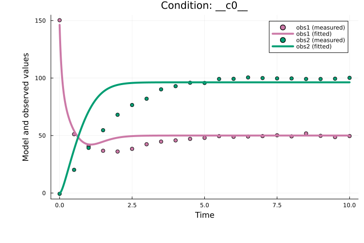 Optimiser algorithm = Optim_IPNewtoncalibrate returns a PEtabOptimisationResult containing the optimized parameters and common diagnostics. To visualize the fit and other diagnostics, see Plotting optimization results. For example, the model fit can be plotted with: