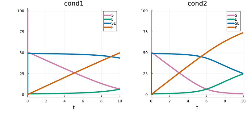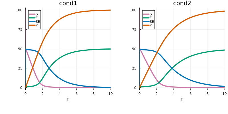 )The values of input1 and input2 are then provided via PEtabCondition. For instance, assign values for two simulation conditions cond1 and cond2:
